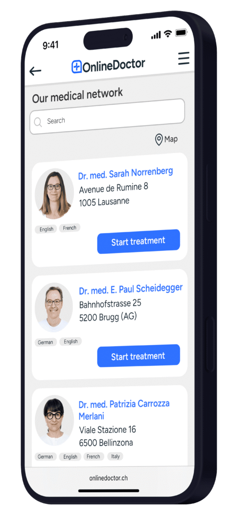 At OnlineDoctor you can choose between 150 dermatologists in Switzerland. Simply click on the maps and find a specialist near you. This way you can quickly and easily have your skin problem clarified online by a local practice.